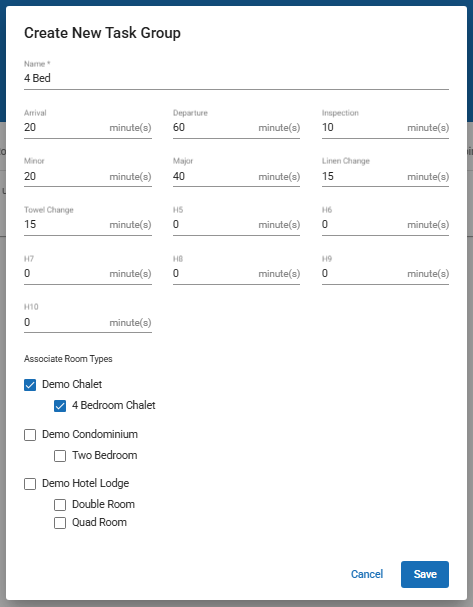 Enter a name of your choice, specify the estimated duration for each cleaning task, select the room types to associate with it, and click Save.