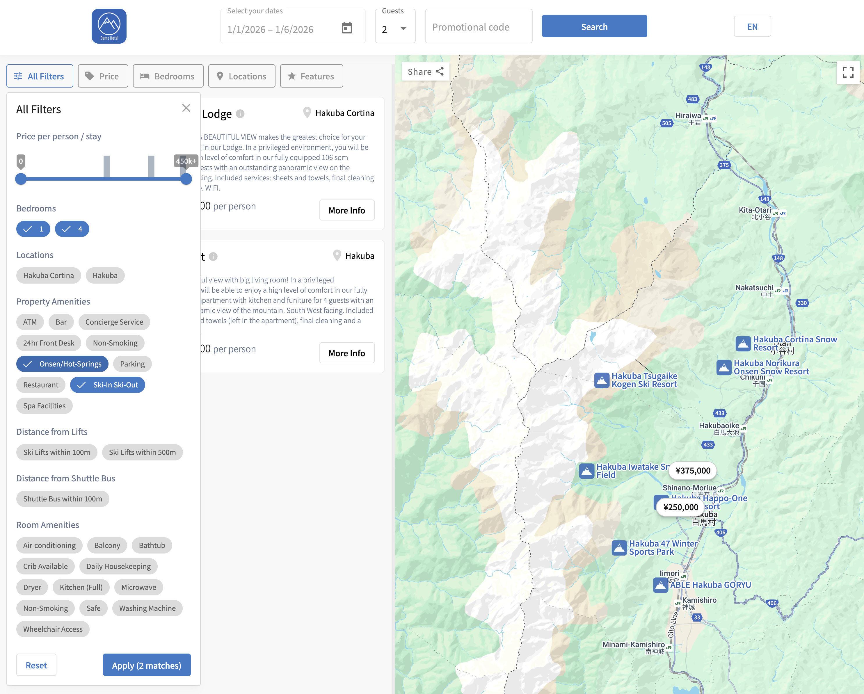 - Tag a property with Onsen/Hot-Spring and Ski-in Ski-Out to help users find chalets with those features.