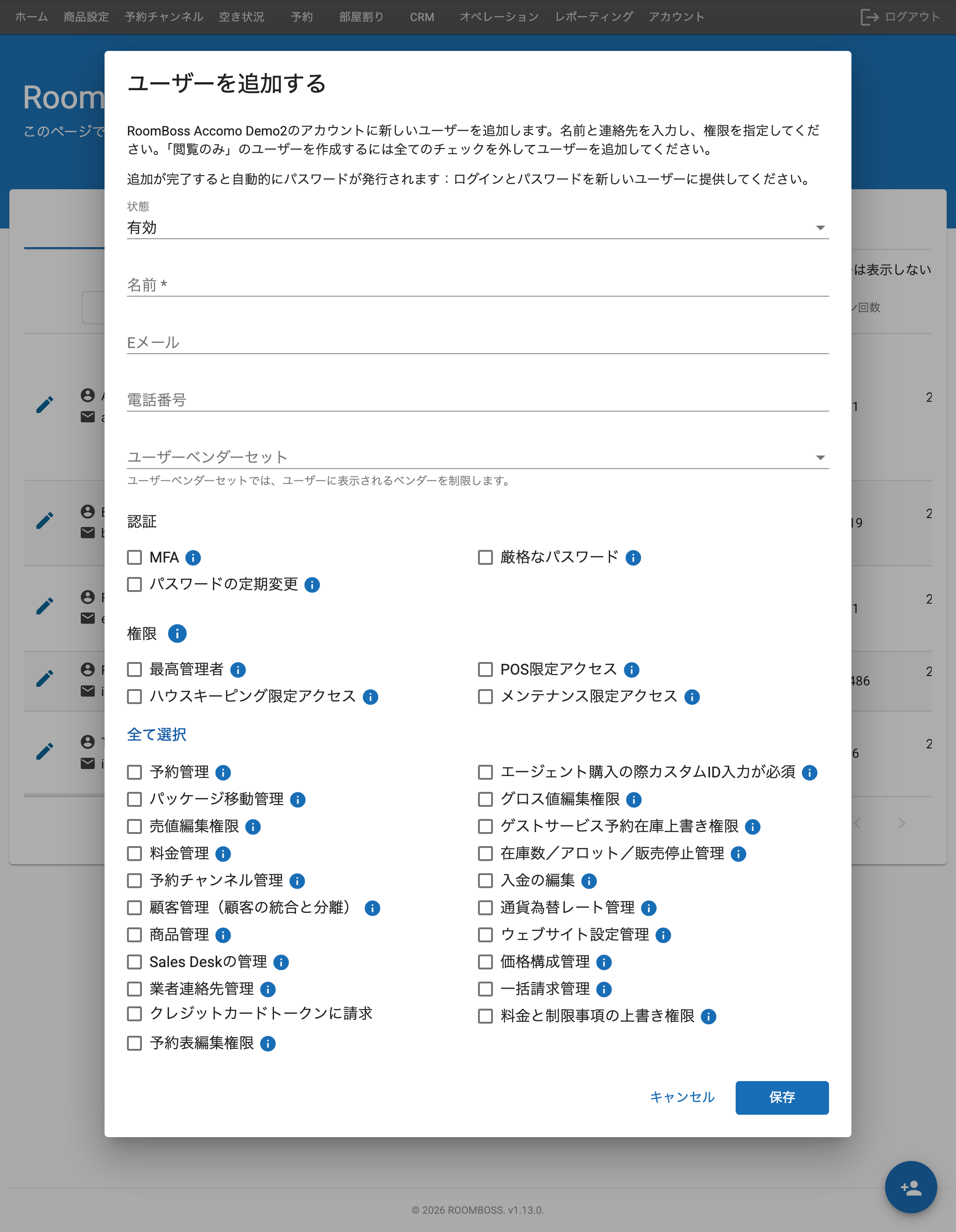 - ユーザーの追加、編集、権限の編集