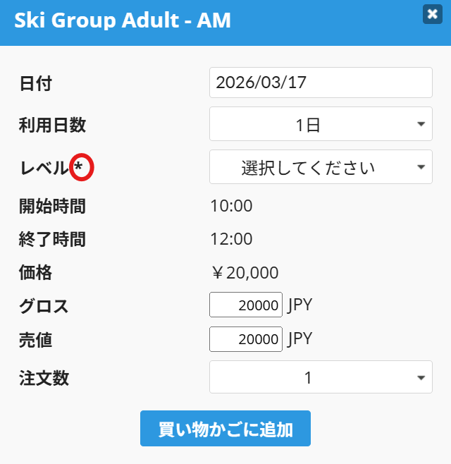 予約ページで必須に設定されているオプションには、アスタリスク*が付きます。