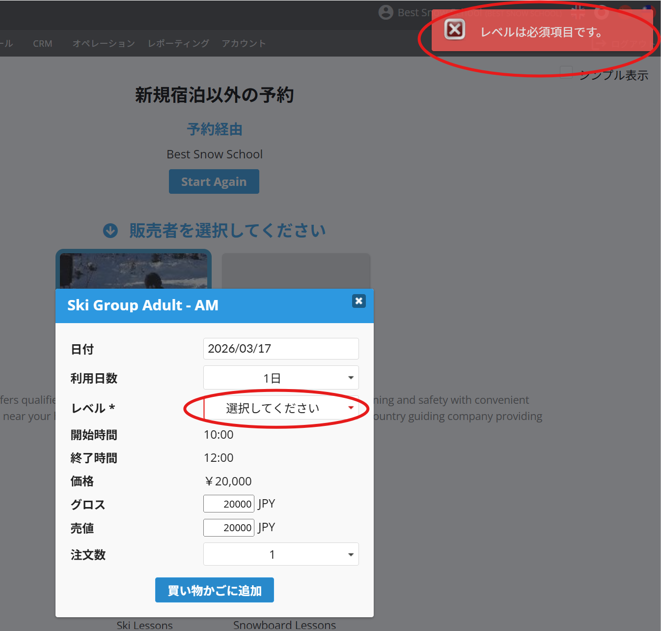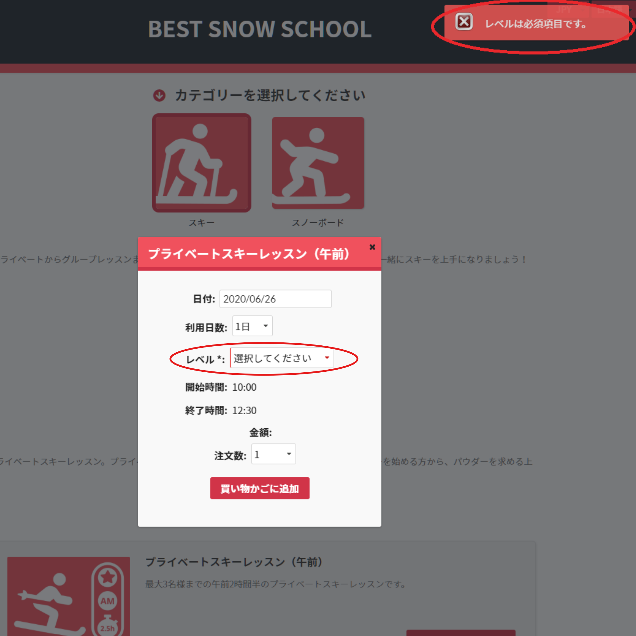 ユーザーが必須オプションを選択せずに、予約作成しようとすると、どのオプションが必須かを示す通知が表示されます。