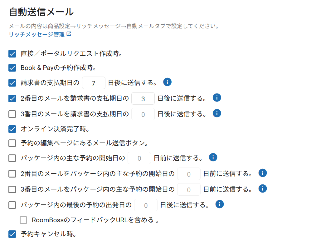 RoomBossのフィードバックURLを含めるにチェックを入れると、Eメールの中にこの予約に関するフィードバックを送信できるアンケートフォームが含まれます。アンケートフォームはマージタグを使ってEメールテンプレートの中に追加できます。