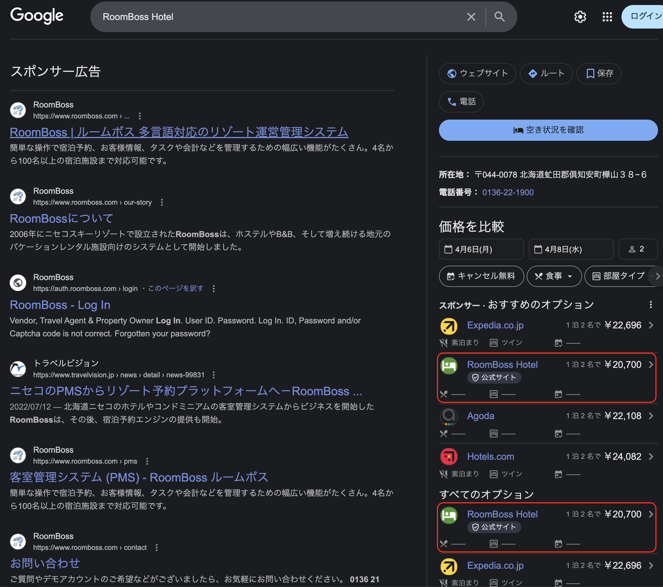 貴施設は Google 上で 2 つの方法で表示される可能性があります。必要に応じて RoomBoss が Google Hotel Ads に入札し、Google はどちらか、または両方の掲載枠を表示する場合があります。