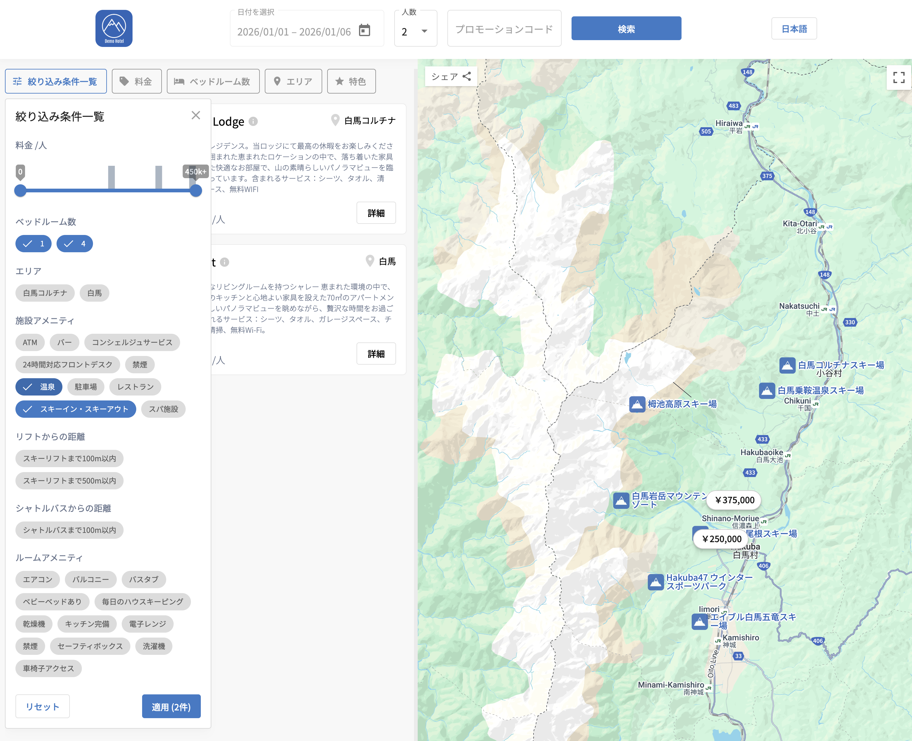 - 施設に 温泉 と スキーイン・キーアウト を設定して、条件に合うホテルを見つけやすくする。