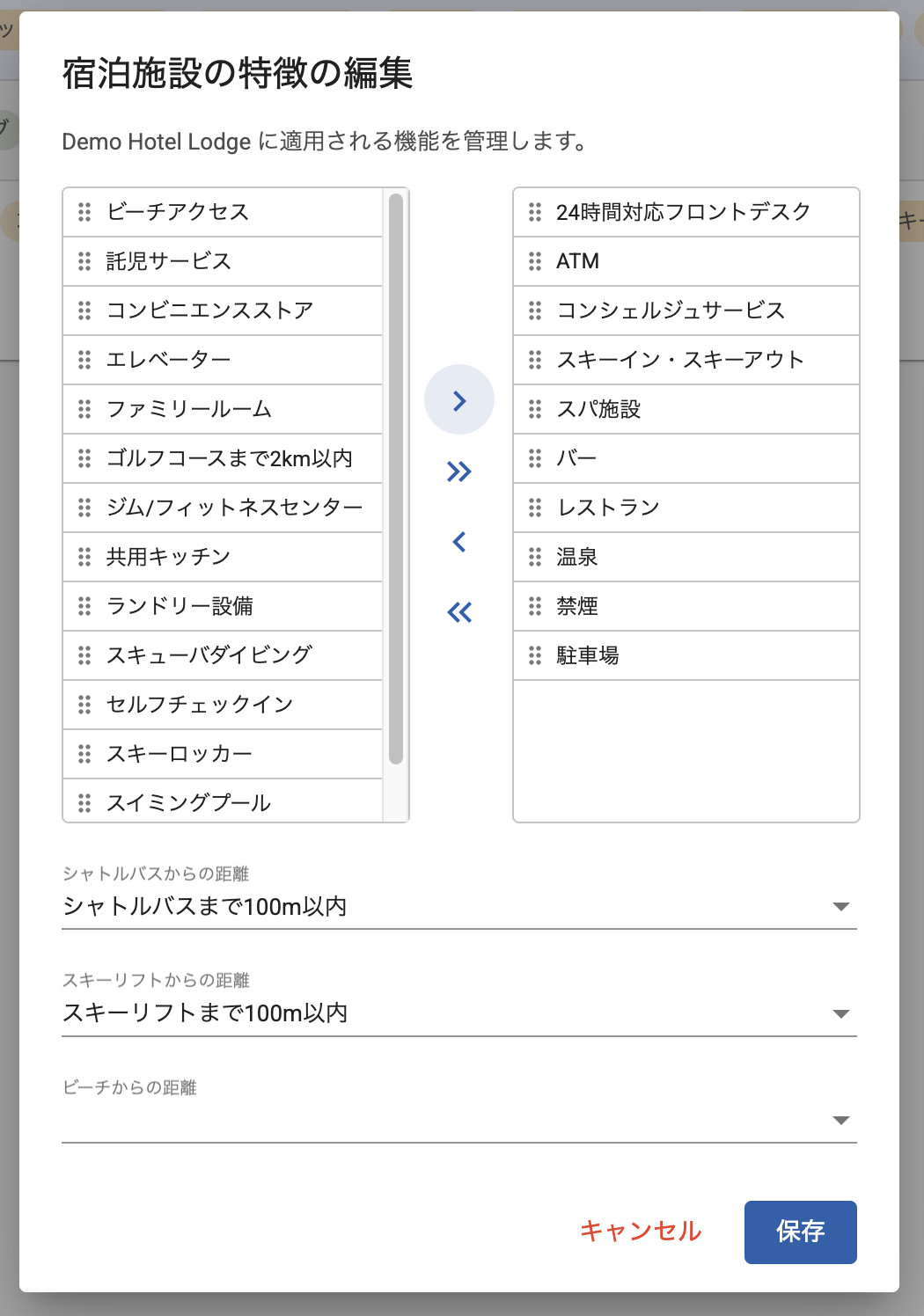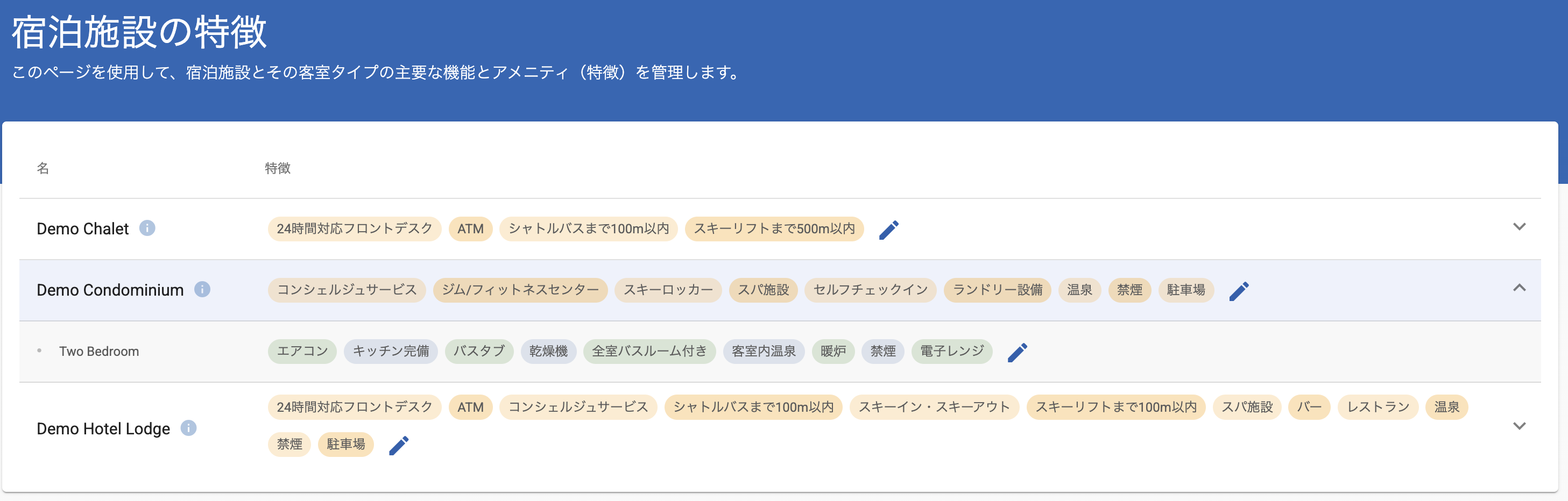宿泊施設の特徴 ページでは、宿泊施設や部屋タイプに対して 温泉, スキーイン・スキーアウト, 駐車場 などの主要な設備や特色を設定できます。